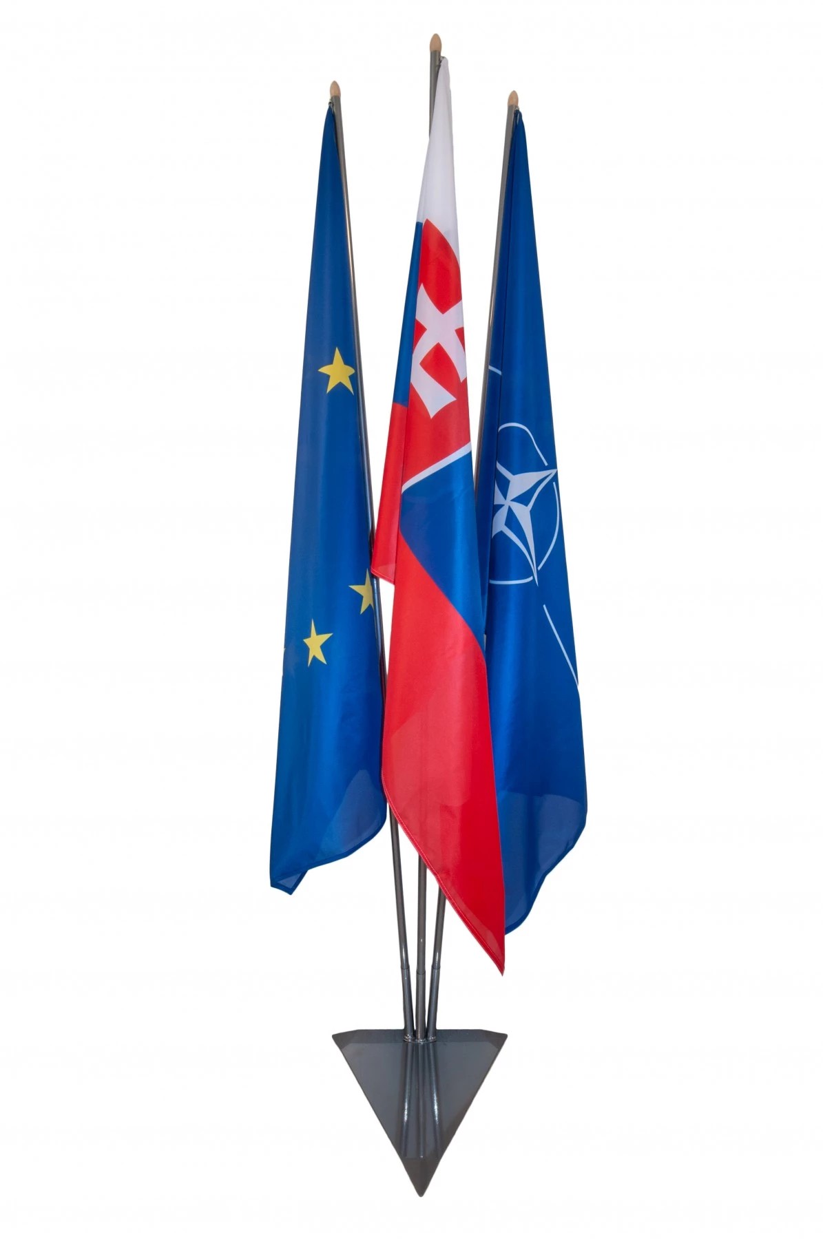 Ak potrebujete zavesiť tri vlajky, vyberte si trojramenný stojan. Ideálne sa hodí do zasadacích miestností a na medzinárodné konferencie. Chrómovaný podstavec zaistí potrebnú stabilitu. Veľmi pekne vyzerá tento set v rohu každej miestnosti.